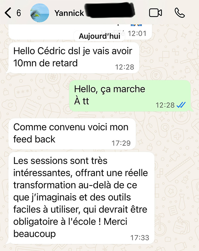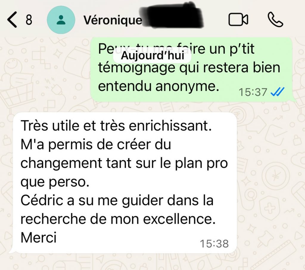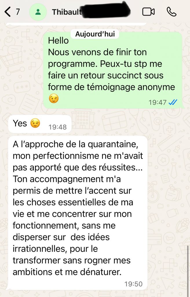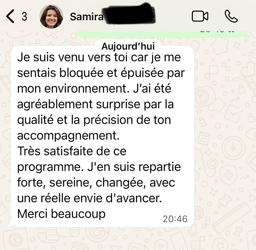 Je propose toujours un appel découverte offert. Cet échange permet de voir si le feeling est là, si ma méthode te parle, et surtout si tu te sens compris(e), challengé(e) et respecté(e).