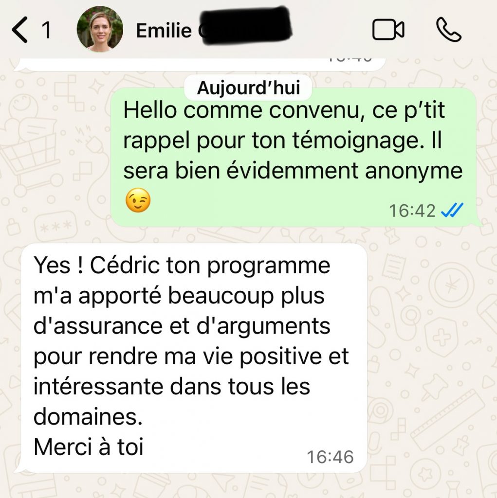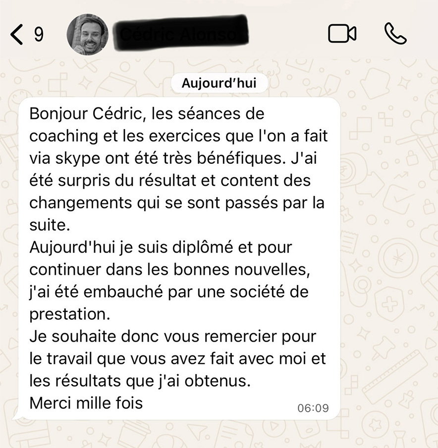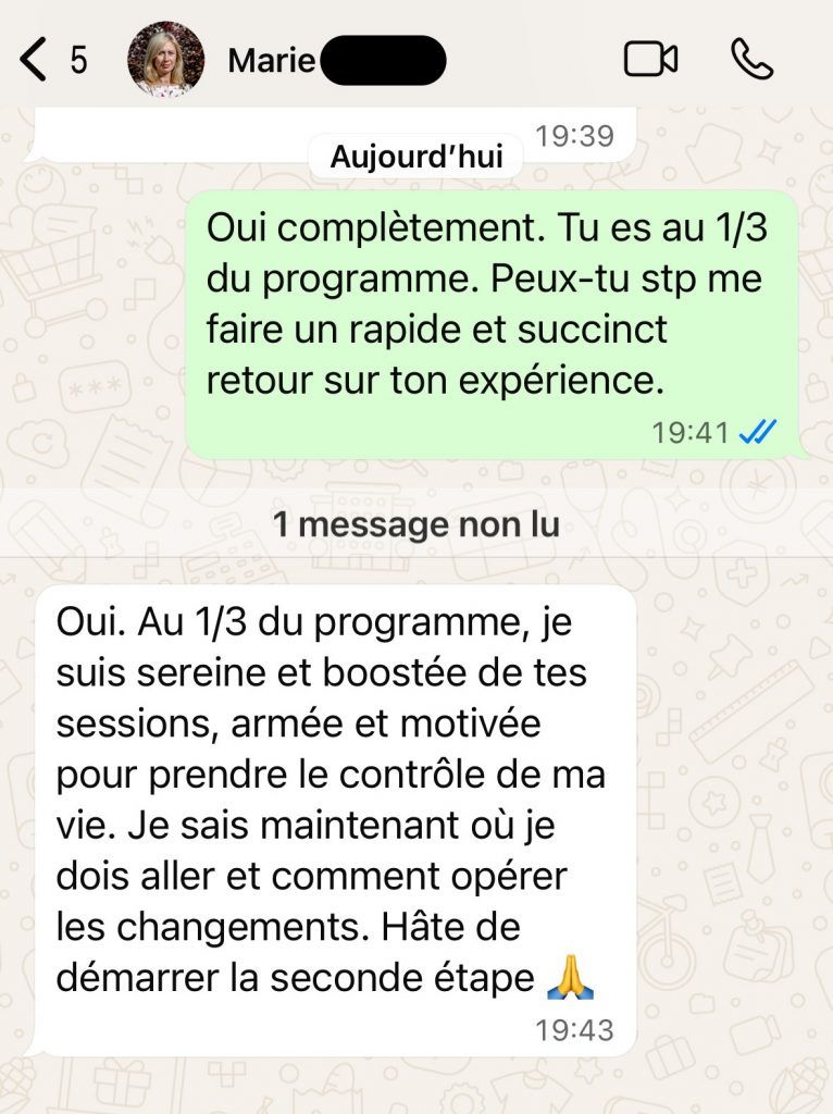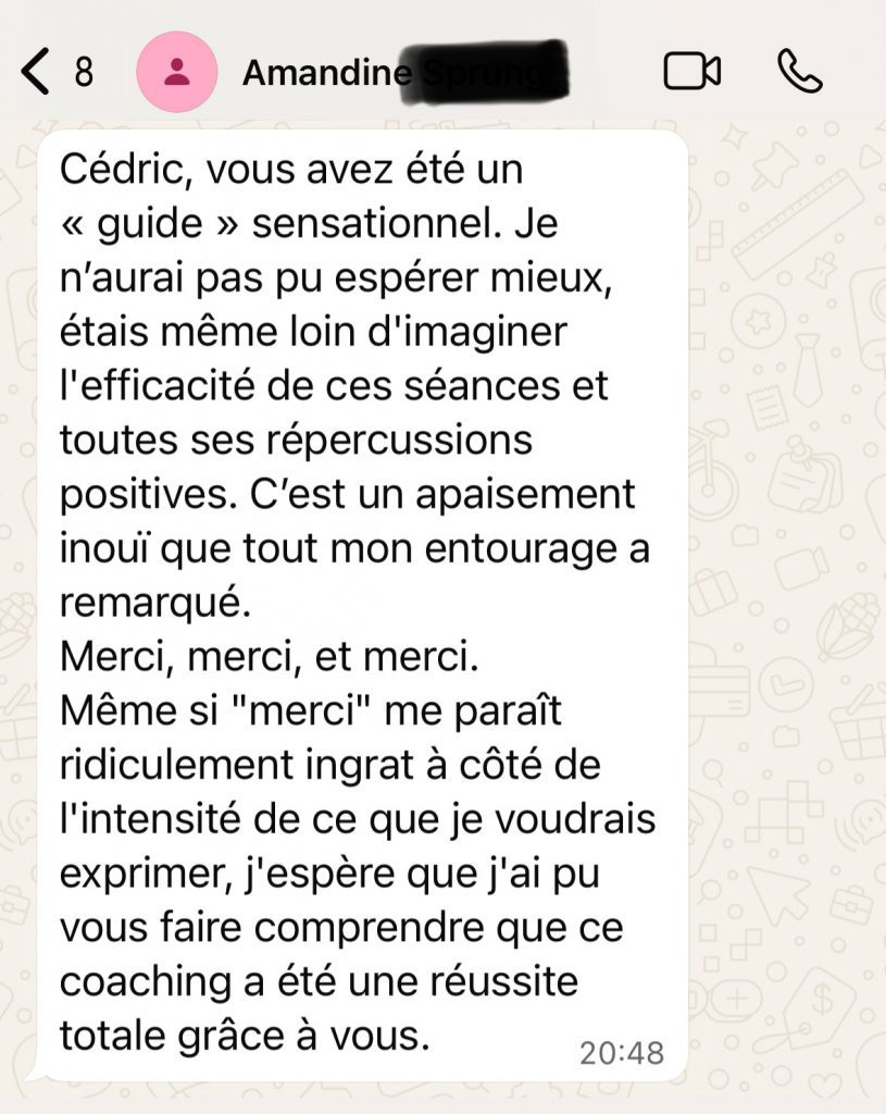 Je propose toujours un appel découverte offert. Cet échange permet de voir si le feeling est là, si ma méthode te parle, et surtout si tu te sens compris(e), challengé(e) et respecté(e).