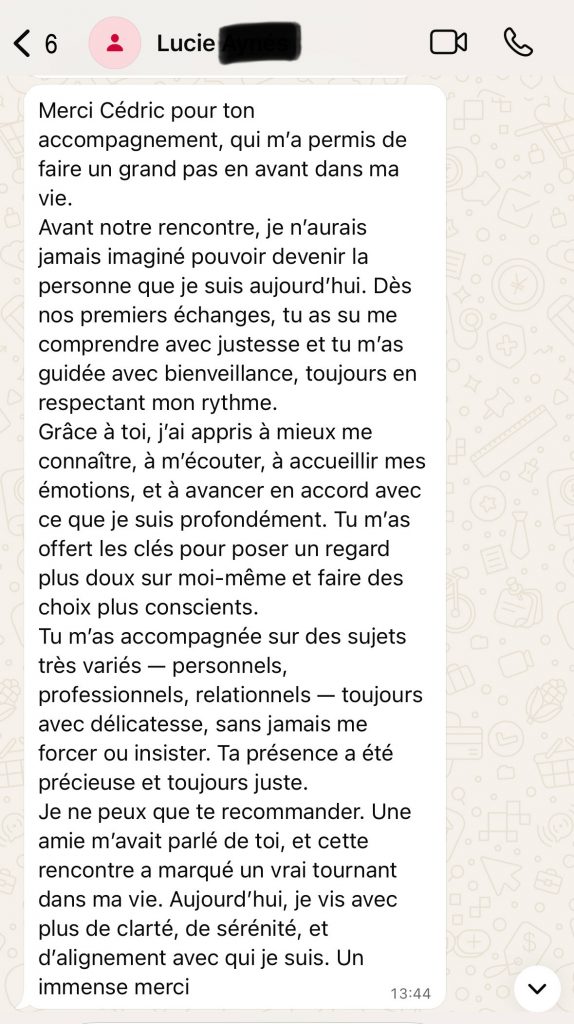 C’est une inquiétude légitime. L’accompagnement est progressif et balisé. On n’ouvre jamais un sujet sans avoir les outils pour le traverser. Vous n’êtes jamais seul(e) dans le processus. Vous serez à la fois guidé(e) avec douceur et accompagné(e) avec précision et sécurité, pour ne pas rester bloqué(e) dans l’émotion.